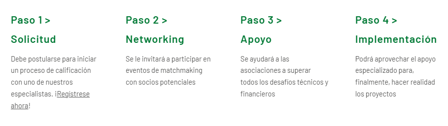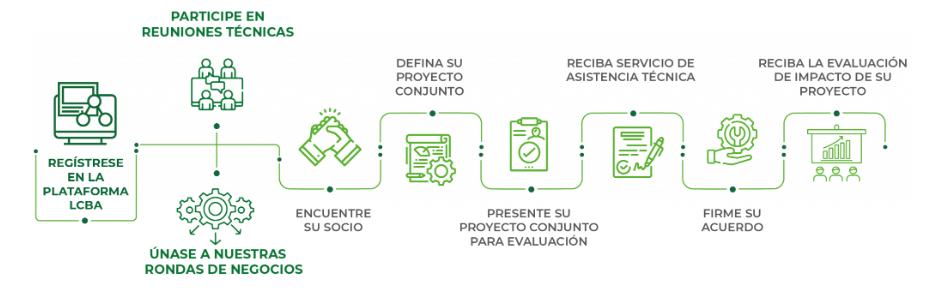 Plataforma para hacer negocios financiada y apoyada por la Unión Europea destinada a desarrollar relaciones de valor añadido B2B entre proveedores de tecnologías bajas en carbono de la UE y empresas que buscan soluciones sostenibles en Argentina, Brasil, Chile y Colombia. Este proyecto también se está implementando en México y Canadá.